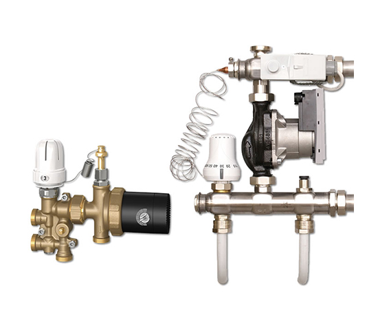 Komplett anschlussfertiges Mischmodul zur Regelung der Vorlauftemperatur von Fußbodenheizungen.