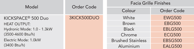 Een Kickspace eenheid die is aangesloten op de centrale verwarming maar een optie voor elektrische verwarming bevat, wanneer de centrale verwarming niet aanstaat.