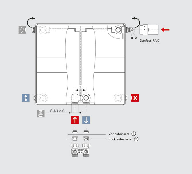 De radiator wordt geleverd met een te monteren beschermkap. Na het verwijderen van de beschermkap (pos. A) kunnen de thermostaatkoppen „RAX“, „RA 2000“ of „RAW“ van het bedrijf Danfoss, „VK“ van het bedrijf Heimeier, „D“ van het bedrijf Herz, „DA“ van het bedrijf MNG en „UNI XD“ van het bedrijf Oventrop direct op het inbouwventiel (pos. B) worden gemonteerd.