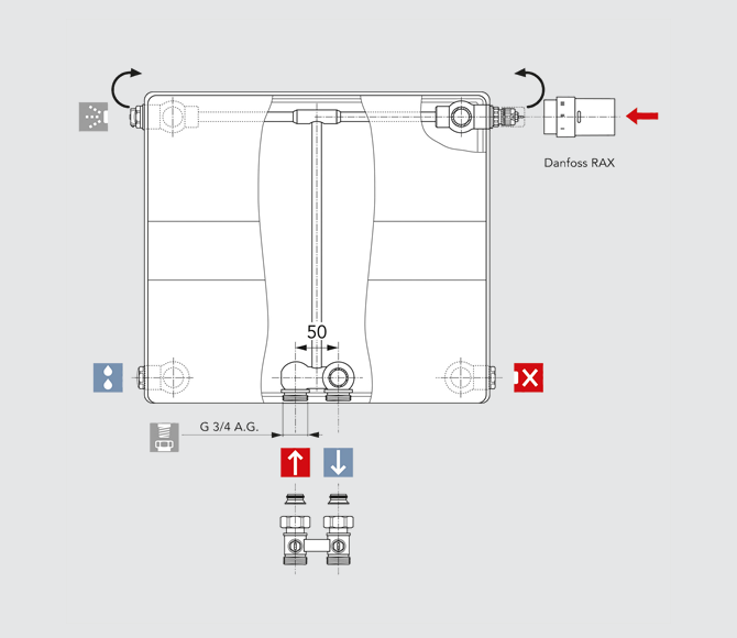 De ULOW-E2 is geschikt voor systemen met twee leidingen en ook voor systemen met een leiding. In aanvulling op de centrale aansluiting beneden is het technisch geavanceerde ontwerp ook voor andere, bij compacte radiatoren bekende aansluitmogelijkheden, zoals eenzijdige en dubbelzijdige aansluiting geschikt.