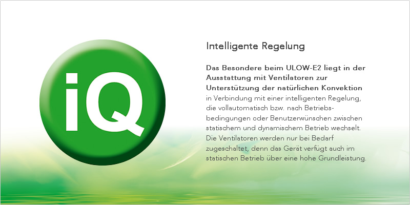 Het bijzondere bij de ULOW-E2 is de uitrusting met ventilatoren ter ondersteuning van de natuurlijke convectie in combinatie met een intelligent besturingssysteem, dat automatisch of volgens bedrijfsomstandigheden of gebruikerswensen tussen statische en dynamische werking wisselt.