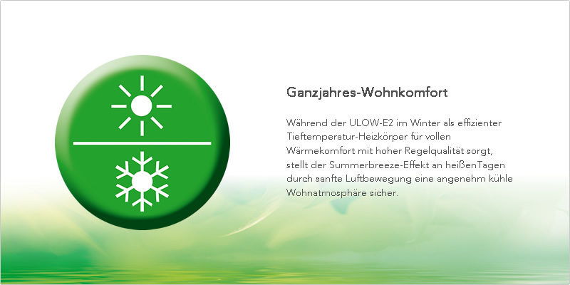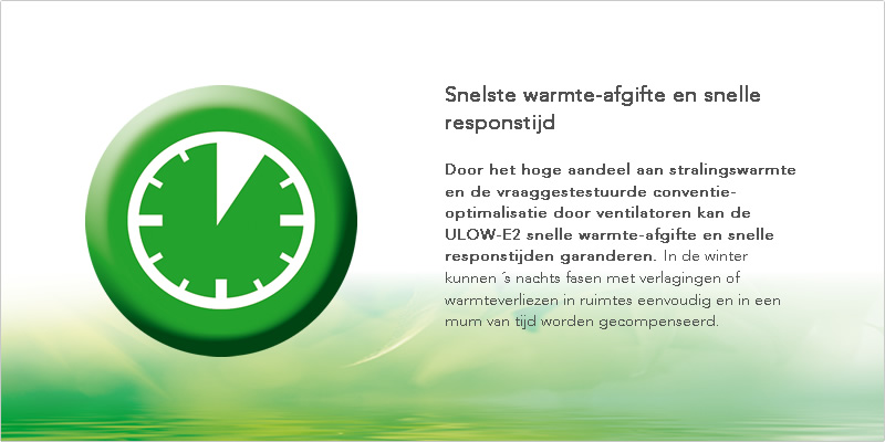 Door het hoge aandeel van stralingswarmte en de vraaggestuurde conventie-optimalisatie door ventilatoren kan de ULOW-E2 snelle warmte-afgifte en snelle responstijden garanderen. In de winter kunnen ´s nachts fasen met verlagingen of warmteverliezen in ruimtes eenvoudig en in een mum van tijd worden gecompenseerd.
