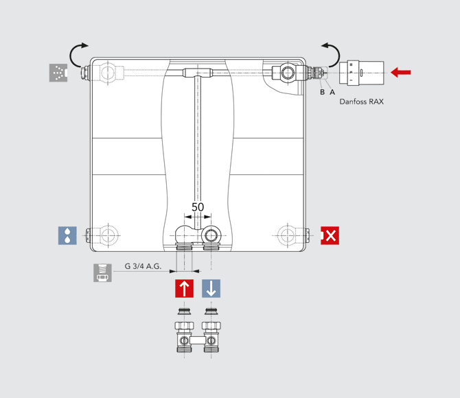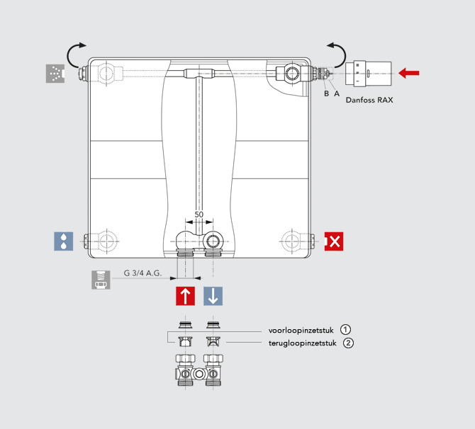 De radiator wordt geleverd met een te monteren beschermkap. Na het verwijderen van de beschermkap (pos. A) kunnen de thermostaatkoppen „RAX“, „RA 2000“ of „RAW“ van het bedrijf Danfoss, „VK“ van het bedrijf Heimeier, „D“ van het bedrijf Herz, „DA“ van het bedrijf MNG en „UNI XD“ van het bedrijf Oventrop direct op het inbouwventiel (pos. B) worden gemonteerd.