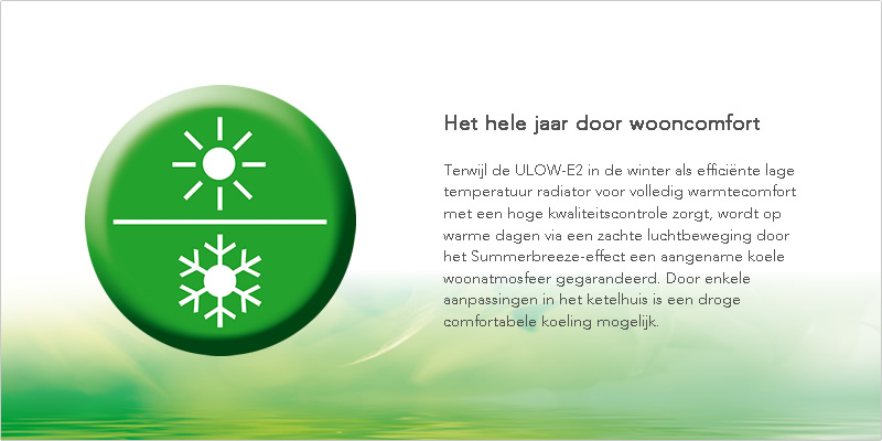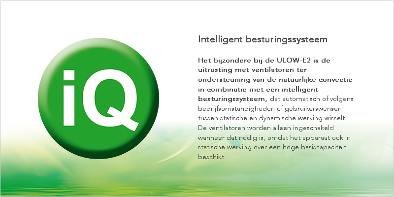 Het bijzondere bij de ULOW-E2 is de uitrusting met ventilatoren ter ondersteuning van de natuurlijke convectie in combinatie met een intelligent besturingssysteem, dat automatisch of volgens bedrijfsomstandigheden of gebruikerswensen tussen statische en dynamische werking wisselt.